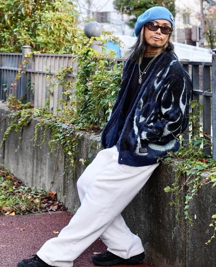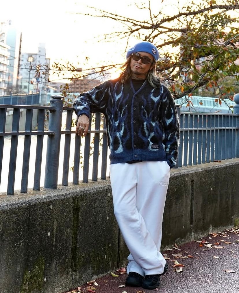 3種類のフレイムスをMINATO 氏が書き下ろし、フレイムス同士が重なる箇所まで繋がる様に立体的に組み立てて構築したオリジナルデザインのカーディガン。