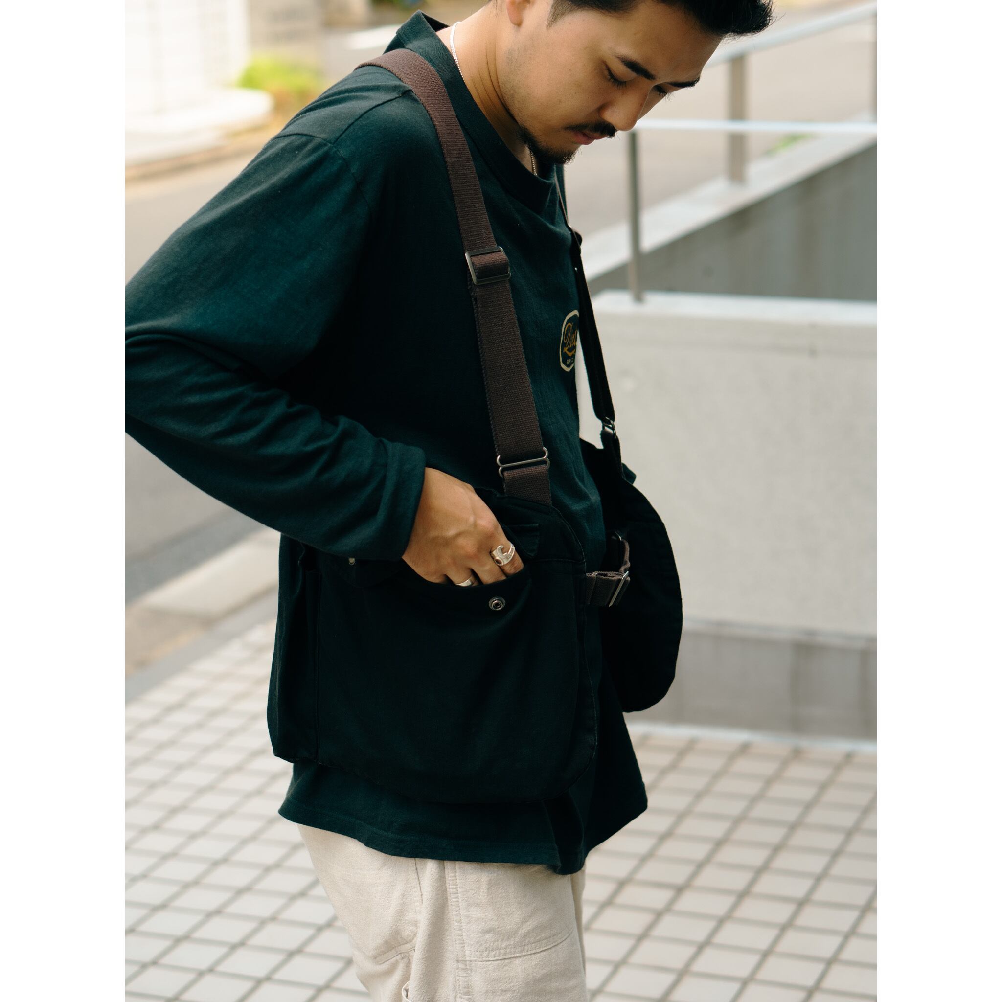 フロント左右に着くフラップ付きポケットは大き目の作りとなっており、背面のゲームポケット(昔は獲物を入れていた)も 大容量で、ちょっとした 荷物ならバッグ不要です。