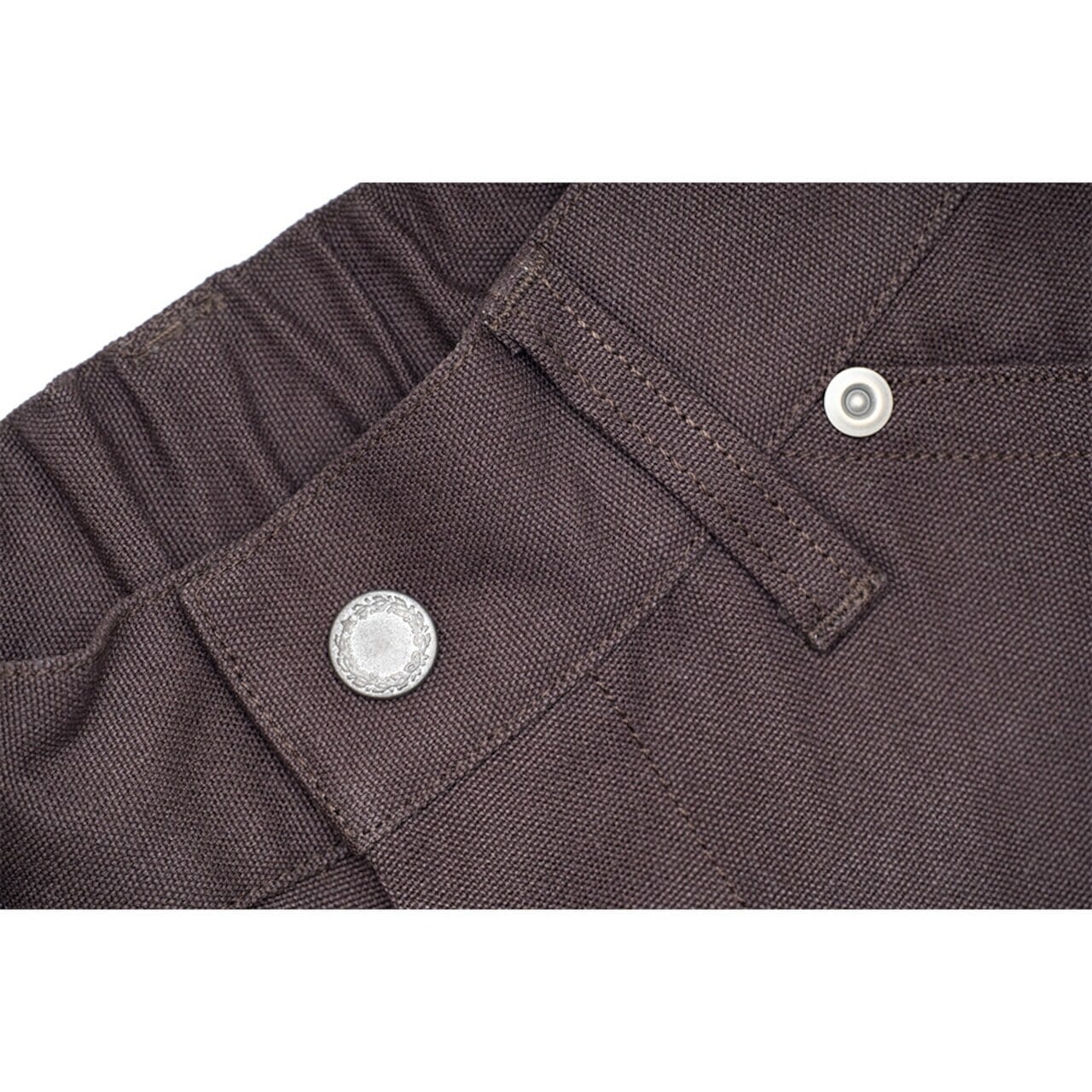 従来のハンマーループ、ツールポケットのディティールはそのままにフロントボタンはスナップボタンを採用し脱着が非常に楽で、ウエスト背面部分に平ゴムを入れる事でウエスト寸法に約5cm(平置き)の許容があり着用時のストレスを軽減します。