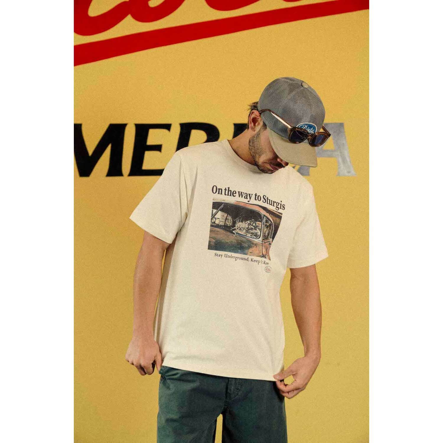 1991年。バイカーたちの聖地・サウスダコタ州スタージスへ向かうロードトリッ プ。そのリアルな旅の軌跡を、MOTORCYCLE業界のレジェンドフォトグラファー 伊勢 悟(Ise Satoru) 氏がフィルムに焼き付けた。その貴重な瞬間を、フォトプリントTEEとしてAT DIRTYが蘇らせた。コットン100%の6オンスオリジナルボ ディー。ビンテージディテールの裾引きシングル(天地引き)で縫製。ネック回りはタコバインダーで仕上げおり、着心地と耐久性に優れている。