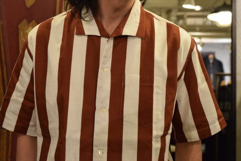 DHの開襟シャツ等で頻繁に使用されるバニラン生地は雰囲気ある見た目に加え、凹凸感のある素材の特性として肌に密着する面積が少ない分、サラッと着用でき、汗をかいた後にもまとわりつかず快適に着て頂けます。